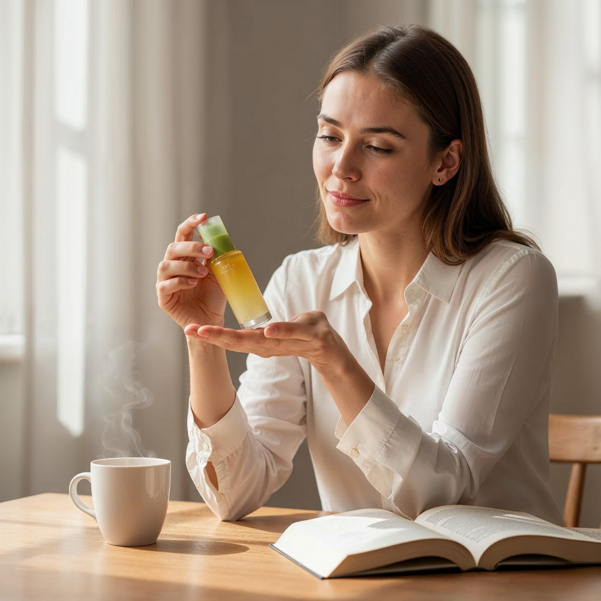 Ze stond in de badkamer toen haar zoon binnenwandelde, slaperig en nieuwsgierig. “Wat doe je, mam?” vroeg hij. Ze liet het serum zien. “Voor een frisse start.” Hij wilde ook, natuurlijk en binnen een seconde zat er een druppel op zijn mouw en een kloddertje op de tegels. Ze lachten allebei, en de haastige ochtend voelde ineens lichter. Terwijl ze hem schoonveegde, wees hij op het flesje. “Is dat beter voor de aarde, mam?” Ze knikte. “Minder rommel, betere keuzes.” Hij dacht even na, keek haar aan en zei: “Dan ben jij mooi én lief voor de wereld